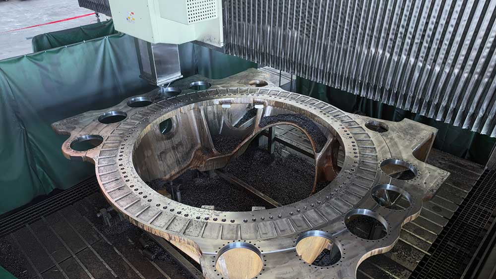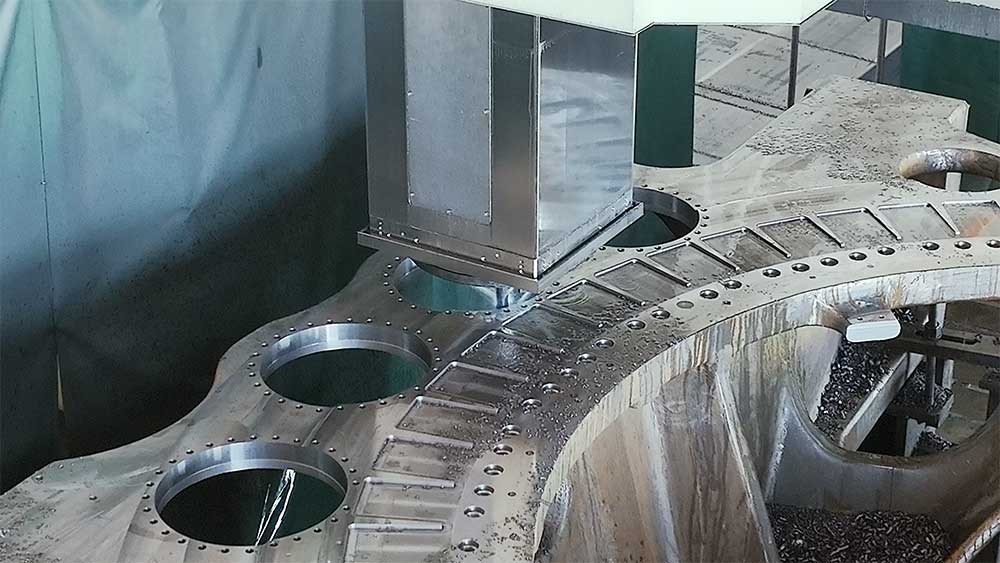 甘肅日月主要生產(chǎn)配套陸上風(fēng)機(jī),包括風(fēng)機(jī)的輪轂和底座,這就要求機(jī)床具備高剛性、強(qiáng)力切削、加工范圍廣的特性。廠區(qū)內(nèi)8臺海天精工大型重型龍門加工中心擁有超寬方滑枕、6米門寬,像穩(wěn)固的磐石使加工過程運(yùn)行穩(wěn)定。甘肅日月生產(chǎn)副廠長蔡安強(qiáng)對此表達(dá)了贊賞:“海天精工龍門的滑枕寬度比一般的都大,達(dá)到了500×500,完全滿足切削的剛性要求。”