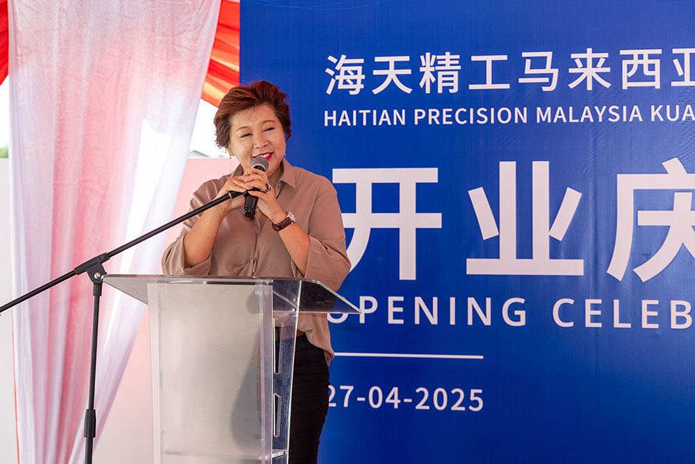 最后,馬來西亞縱橫集團(tuán)CEO Christian女士作為客戶代表上臺(tái)講話,表達(dá)了對(duì)海天精工的感謝。海天精工穩(wěn)定可靠的設(shè)備與售后服務(wù)為其生產(chǎn)經(jīng)營(yíng)帶來諸多利好,希望與海天精工維持密切合作。
